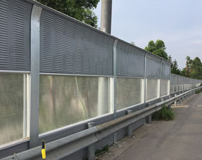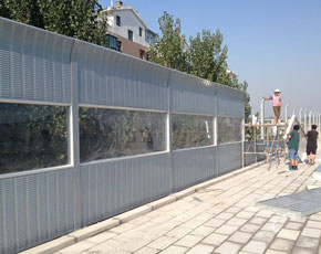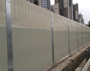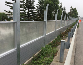 隔声屏障是在声源与受声点之间设置的一种声学遮挡装置,以阻止声波直接传播。在声屏障后形成声影区,使声能量的影响降低,是防止噪声传播的有效设施,尤其适用于降低户外声源,如冷却塔、空调机组及交通噪声等对环境的干扰。公路声屏障主要由钢结构立柱和吸隔声屏板两部分组成,立柱是声屏障的主要受力构件,它通过螺栓或焊接固定在道路防撞墙或轨道边的预埋钢板上;吸隔声板是主要的隔声吸声构件,它通过高强弹簧卡子将其固定在H型立柱槽内,形成公路声屏障。