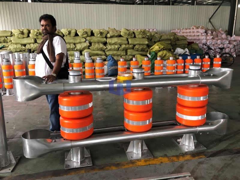 工作原理:旋转桶护栏开创性地采用一种旋转结构,把富有弹性且防撞耐磨的旋转桶支撑在立柱上,使旋转桶可以在立柱上自由旋转,通过旋转桶的这种自由旋转分解汽车撞击力,使垂直于护栏方向的撞击力分解到平行于护栏的方向上,被旋转桶有效地吸收和减小,从而有效地减轻交通事故造成的后果。