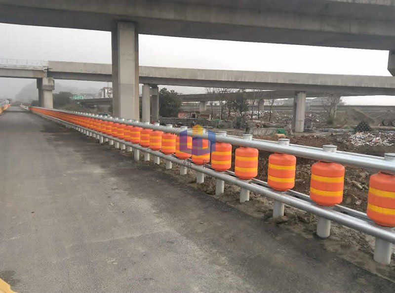 工作原理:旋转桶护栏开创性地采用一种旋转结构,把富有弹性且防撞耐磨的旋转桶支撑在立柱上,使旋转桶可以在立柱上自由旋转,通过旋转桶的这种自由旋转分解汽车撞击力,使垂直于护栏方向的撞击力分解到平行于护栏的方向上,被旋转桶有效地吸收和减小,从而有效地减轻交通事故造成的后果。